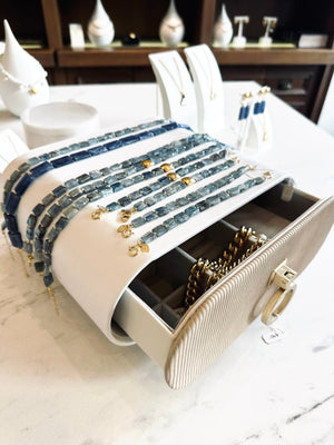 “‘צמיד אייסבריז’ הוא תכשיט שמתעלה מעל טרנדים זמניים. עשוי מאבני קיינאיט נדירות בגווני כחול אפרפר ביניהן משולבות נגיעות זהב הצמיד משדר תחכום טבעי ויוקרה מעודנת. האבנים, הזמינות בלעדית למותג ‘elements by tal man’, מעניקות לצמיד נופך ייחודי שמתאים למי שרוצה להרגיש שונה ומיוחדת.”