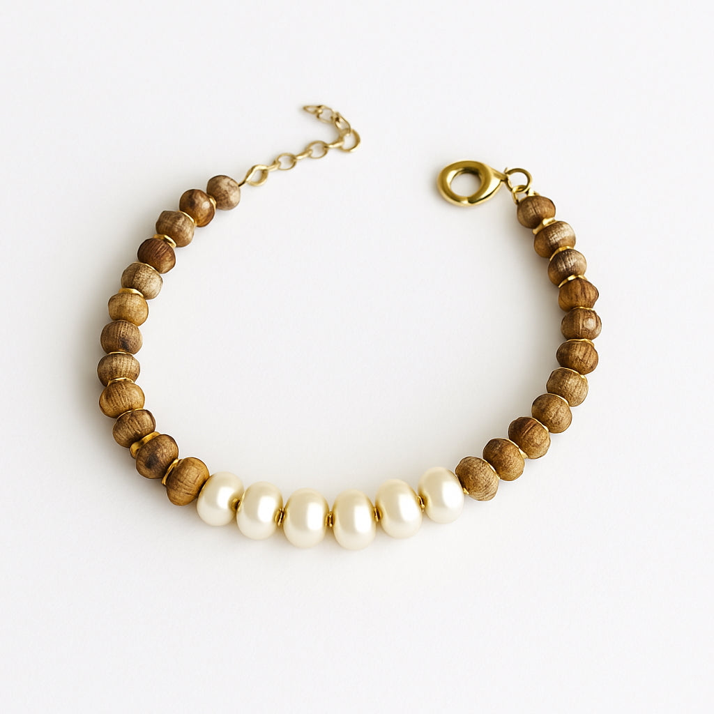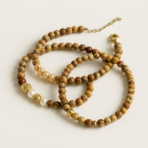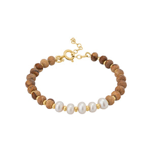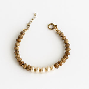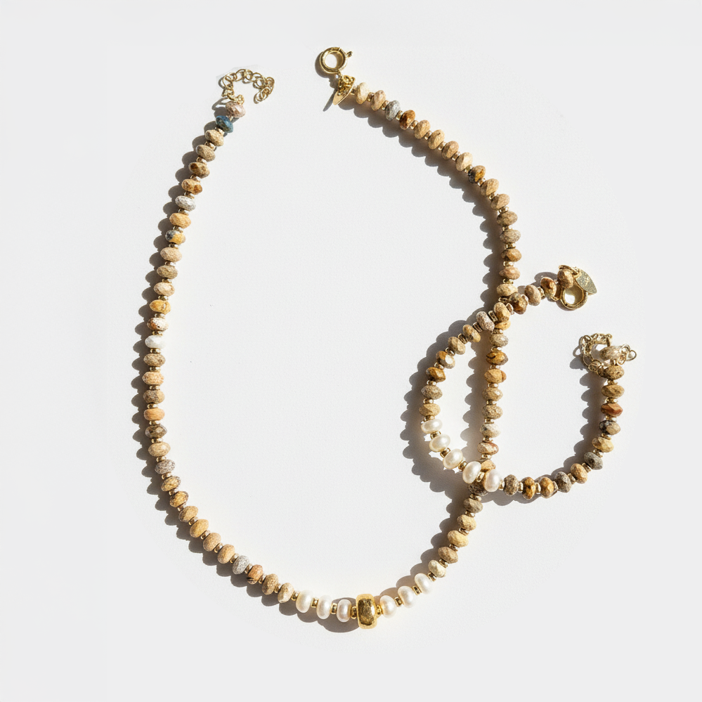 צמיד ‘נשמת המדבר’ עשוי מאבני ג׳ספר בגווני אדמה וארד, עם ברק עדין שמזכיר את אור השקיעה החמה. משולבות בו פנינים אלגנטיות ובין האבנים שזורים חוצצי זהב.