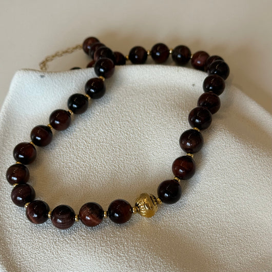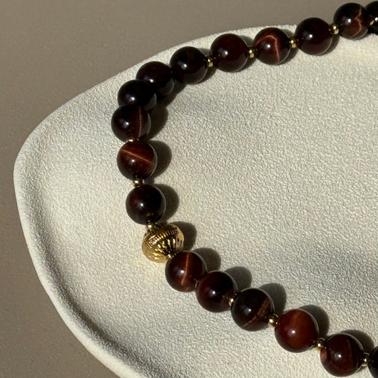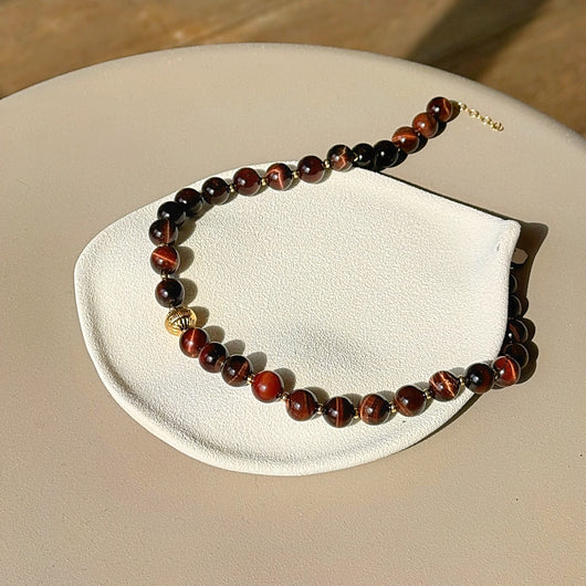 אבני טייגר איי אדומות במראה עשיר ומבריק, בשילוב אלמנט מרכזי בעבודת יד ונגיעות זהב עדינות, יוצרות תכשיט עם אופי חם וסטייל ייחודי.