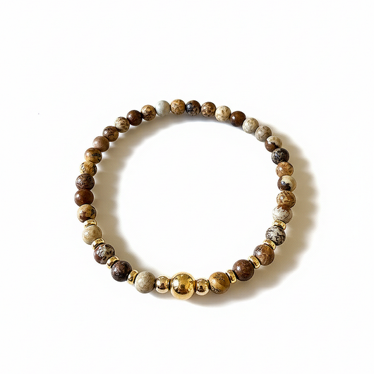 צמיד ‘אדמת זהב’ עשוי מאבני ג׳ספר טבעיות בגוונים חמים של חום וזהב.