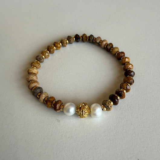צמיד ‘הזוהר הפנימי’ מפגיש בין האנרגיה המחזקת של אבני הג׳ספר לבין הרוך של הפנינים ואלמנט הזהב בסיגנון וינטג׳׳עשוי בעבודת יד