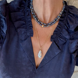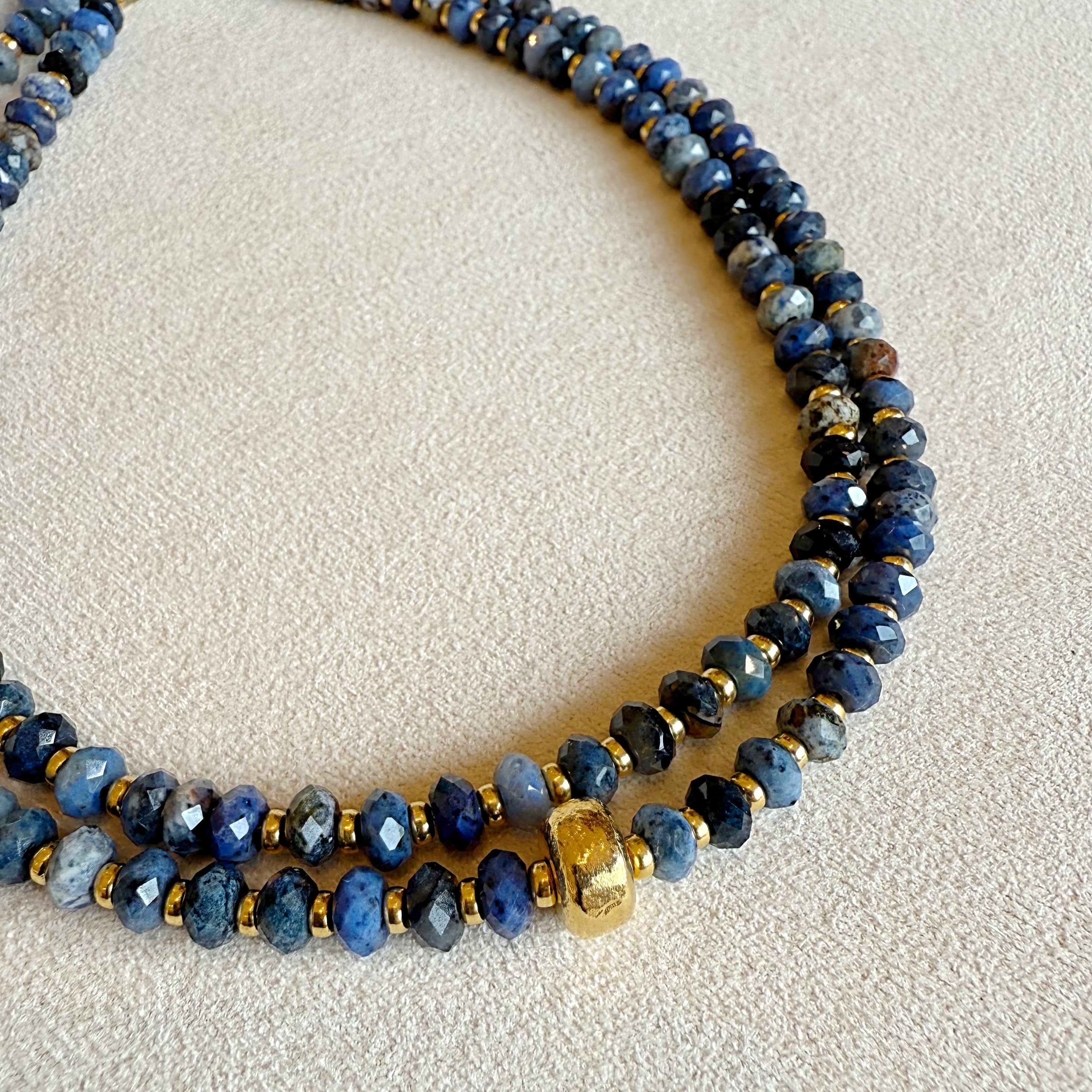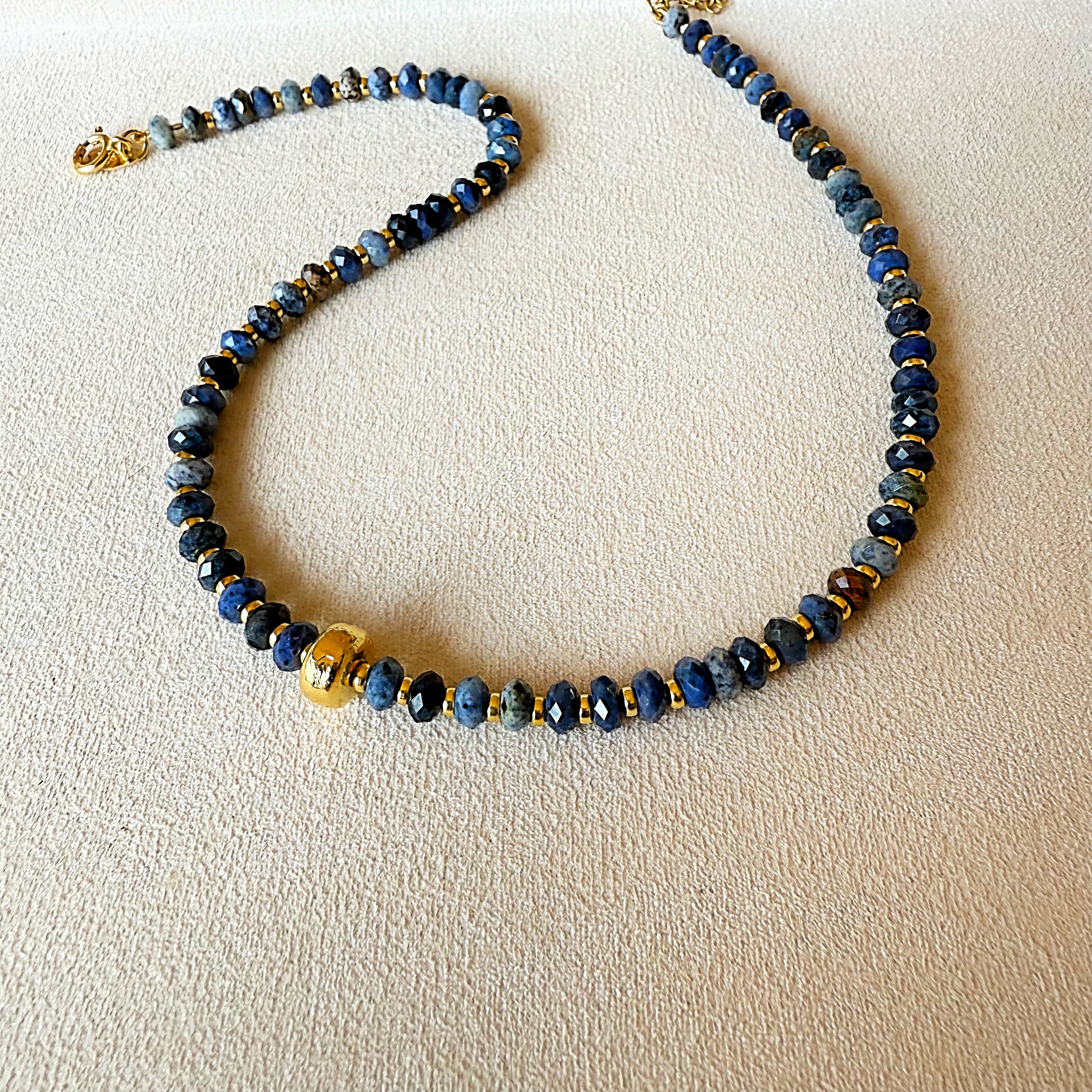 כחול עמוק, זהב חמים וניצוץ עדין של אור.אבני הלאפיס הבוהקות בליטוש facets והאלמנט המוזהב במרכז יוצרים מראה אלגנטי, מסתורי ומלא ביטחון.