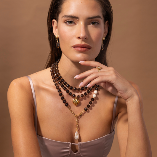 מחרוזת שאטו היא יצירה שמזמינה אותך להתעטף ביופי קלאסי ונוכחות שקטה. עשויה מאבני סמוקי קוורץ בגוון חום עמוק מעושן, היא מעניקה תחושת חיבור לקרקע ושלווה פנימית, בדיוק כמו יין משובח המתיישן בארמון עתיק. בין האבנים משובצות שתי אבני קוראל בגוון שנהב עדין, המסמלות טוהר ורכות, ובמרכז תלויה פנינת בארוק, המשדרת ייחודיות ורכות אלגנטית.